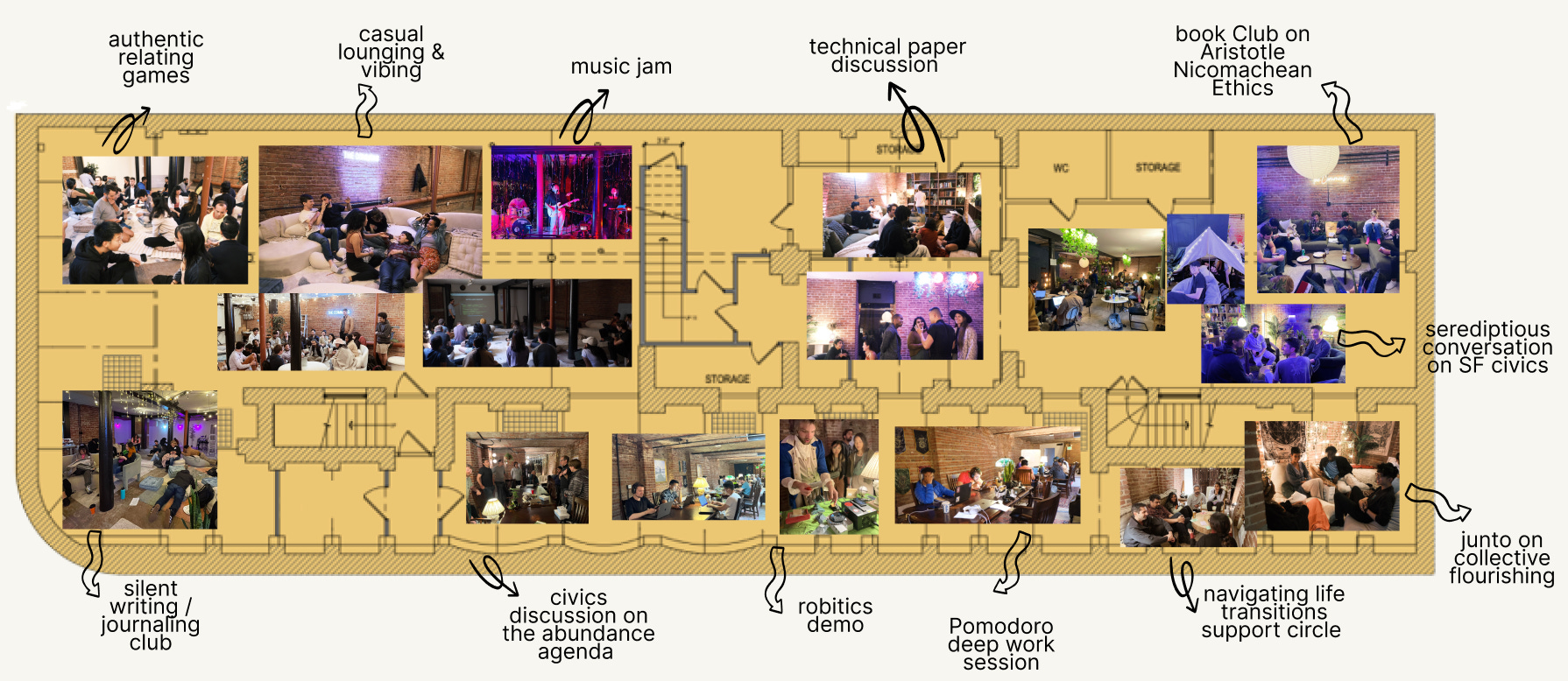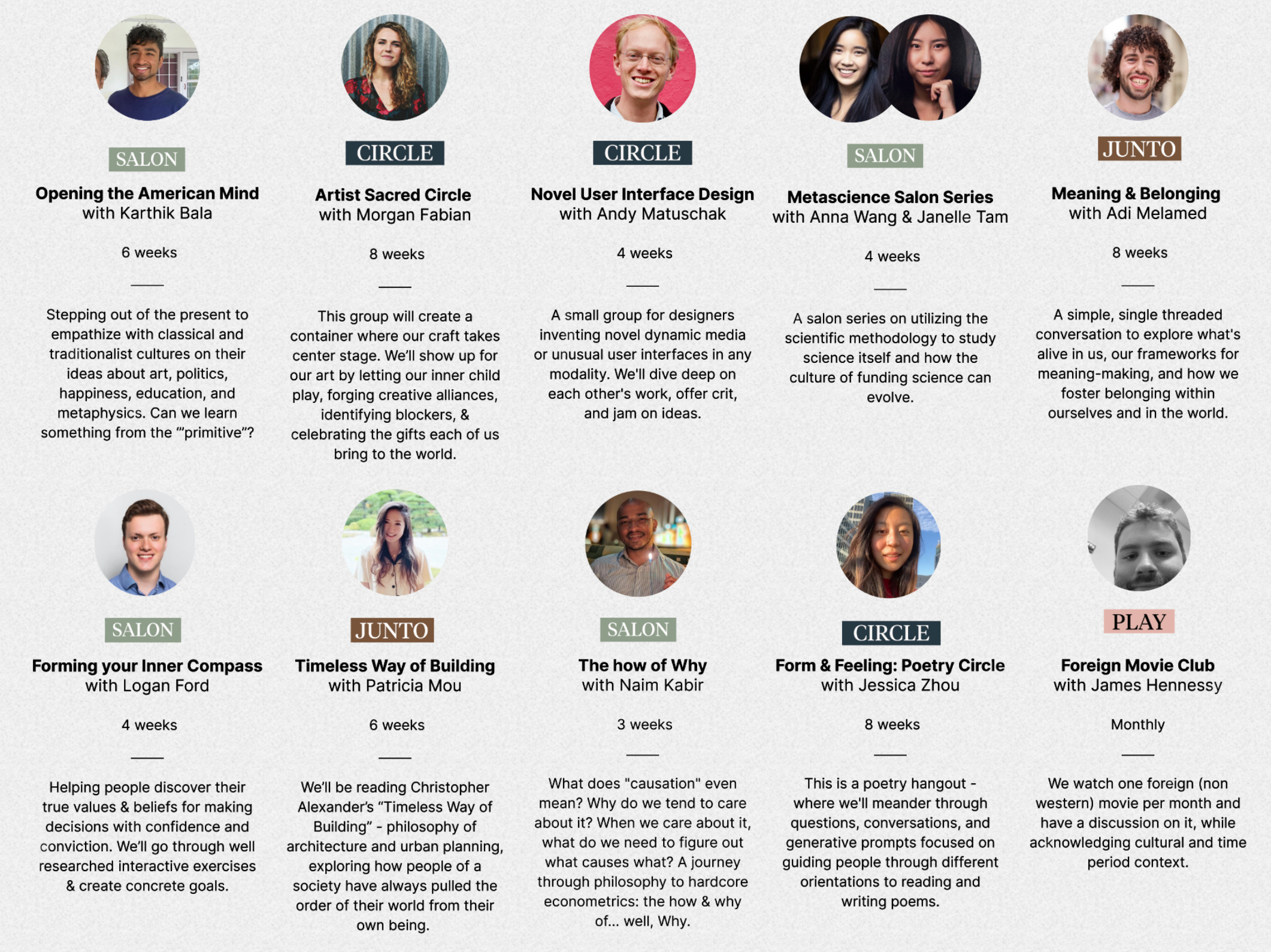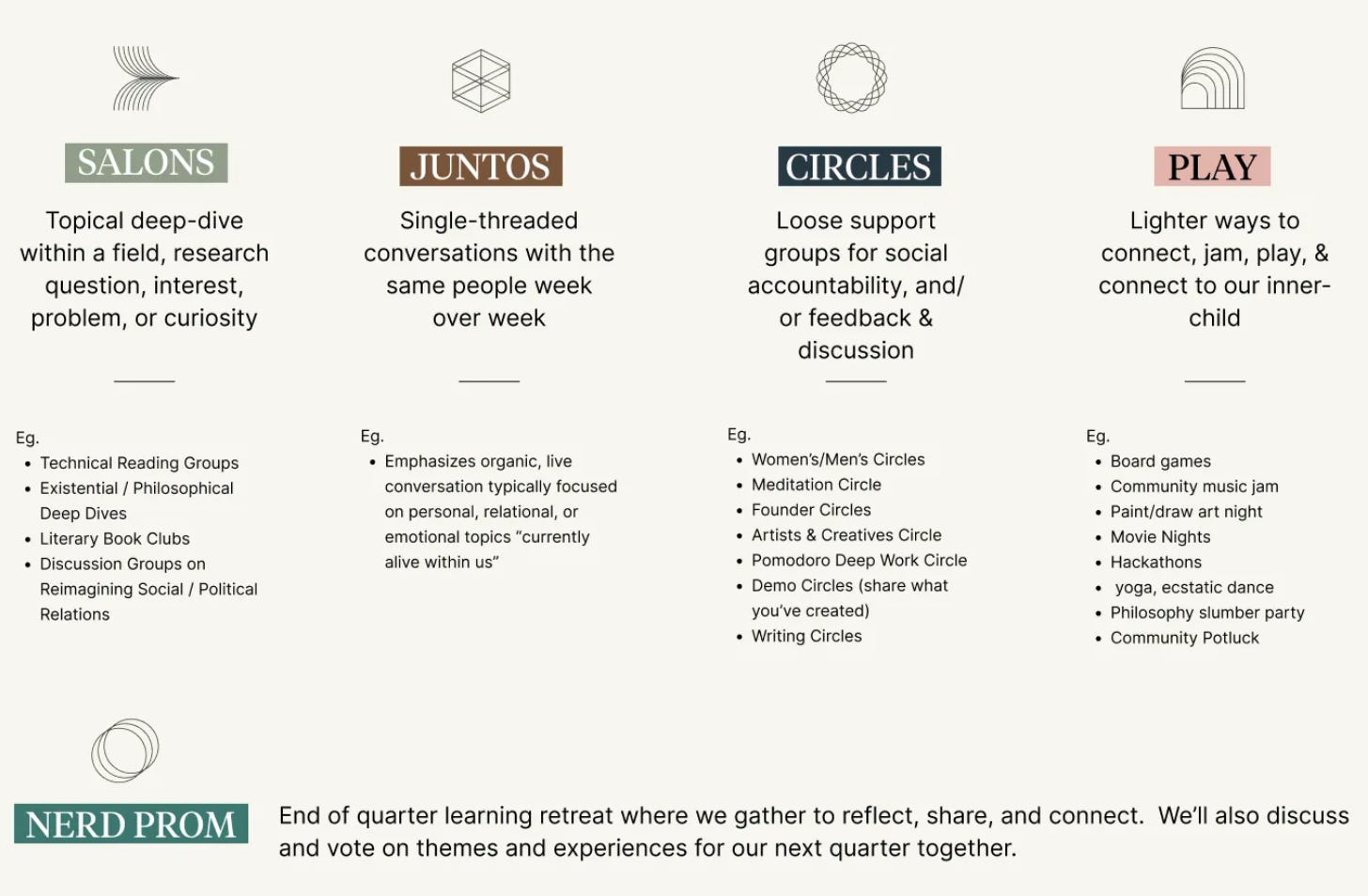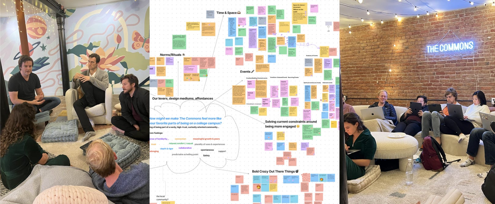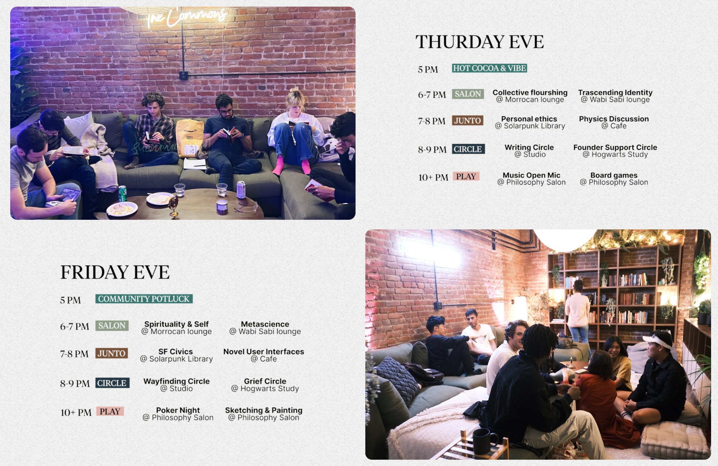 Welcome to Wellness Wisdom - A newsletter for the thoughtful by Patricia Mou. A medley of thoughts on philosophy, meaning-making, & beauty. Support this publication by joining me down the rabbit hole🕳🐇 This is a crosspost from The Commons substack 🏛️Hello lovely humans! It’s been 6 months since we asked ourselves why there weren’t more “community living rooms” in SF. Especially ones founded upon values of open-ended curiosity, co-created play, & collective flourishing. A place to be “fully yourself” while exploring your intellectual, emotional, artistic, & spiritual curiosities, in an earnest, welcoming community. Our answer to that was The Commons. Since opening our doors to the public in September, we’ve run over 90+ salons and events, built a budding 180+ member community, and have had thousands of neighbors come to the space to rest, reflect, & play. Once things settled down a bit, we took a step back to reflect. Together with our member community, we imagined moonshots we could take to achieve our vision of being a second home for the earnest, curious, & agentic souls of SF. Over and over again, the motif of a college commons room kept emerging as a north star. The site of 2am existential conversations, bouts of deep solo contemplation, and intimate encounters with familiar and new faces. A place for intimate, reoccurring, and serendipitous connections built upon a foundation of default trust through shared curiosities, & values. That rare and magical combination of depth and serendipity, of liveliness and familiarity. And this is what we believe will set The Commons apart from other third spaces, co-working spots, or cafes. The ability to build connection between people through shared curiosities and values - as opposed to their demographic, vocation, socio-economic position, or simple desire to work in a second space. For us, the thread that unites every single member at the Commons is their deep earnestness, playful curiosity, abundant kindness, authentic agency, and positive sum mindsets. With this in mind, we’re excited to announce our next big offering: Campus 🏛️Campus is at the core of what it means to be part of the Commons community. A “school” for the soul, intellect, and inner-child.Every quarter, the community creates the “curriculum” and participates in a rotating set of circles, salons, juntos and extracurriculars on dedicated nights at the space. Each “class” – or salon, junto, circle, or extracurricular – runs for multiple weeks and at the end of the quarter, we gather and celebrate our learnings at "nerd prom". The special thing about Campus is in its design: by having multiple juntos, salons, circles, and playful extracurriculars at the space in a given evening - we create a nexus where continuity and intentionality simultaneously alchemize a high density of serendipitous interactions. To help paint a clearer picture: Imagine it’s Thursday and you just got off of work. You head over to The Commons and are greeted with hot cocoa as you briefly chat with old and new friends on what’s been feeling the most alive in you. Afterwards, you attend the 1st out of an 8-week salon on collective flourishing, followed by a mind-opening discussion on the latest abundance agenda in SF civics, journal for a bit with a writing circle, and finally end the night playing board games with new friends. Meanwhile, another friend is around for a physics circle, founder circle, and open mic and you both peel off late into the night for an hour long conversation. On Campus evenings, the whole space will be alive with activities and discussions you can go in-and-out of, akin to a bustling morning market, School of Athens, town square, or yes, college campus. Our first Campus 🏛️ will be taking place starting mid-January 2023 and we are so pumped about the 50+ classes we have on the curriculum. Below is a small sampling of them: As we bring this alive, we will be welcoming new members to the Commons family. If you want to join our first trimester of Campus, and haven’t filled out our application yet, we’re taking submissions for the next cohort of members up through Dec 21st! Until our next dispatch, we just want to end with a thank you – to all our members, donors, and supporters for the energy, enthusiasm, and contributions to a new community living room in SF. With love, |