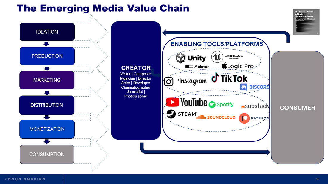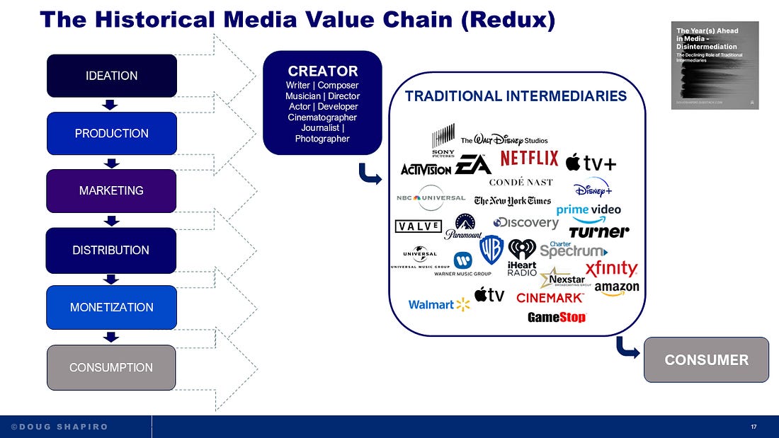 Questa parte così onerosa è stata spazzata via da internet: i creativi e gli autori di un contenuto non hanno più bisogno di intermediari o di costose tecnologie per raggiungere i propri clienti, ovvero le persone interessate a quello che hanno da dire. Se un tempo editori, radio e TV provavano a strappare alla concorrenza volti, voci e firme di punta gli intermediari del presente, le piattaforme tecnologiche fanno lo stesso con autori e creatori. Ciascuna sa che per vincere ha bisogno dei migliori contenuti sulla piazza, e del talento di chi è capace di produrli.